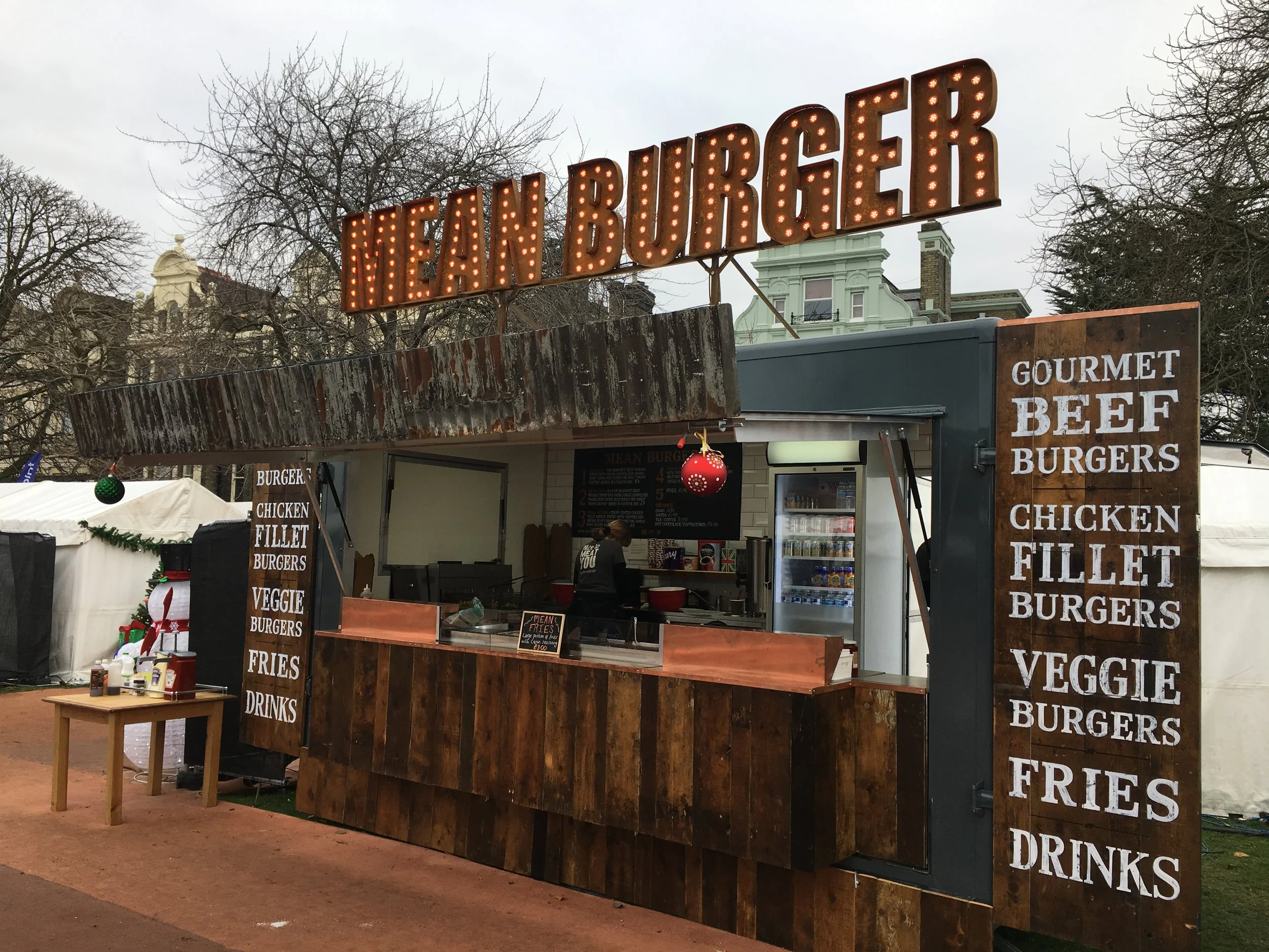 Our brand new gourmet burger van 'Mean Burger' is a contemporary, industrial style catering unit complete with quirky eye-catching features such as a huge festival style festoon light-up sign, reclaimed wooden panelling, metro tiles and beautiful copper counters. It is the perfect addition to any outdoor event, be it a festival, concert or party.